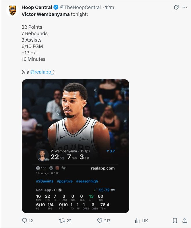 文班亞馬全場(chǎng)比賽16分鐘,10中6,三分4中1,罰球10中9,拿到22分7籃板3助攻1失誤,命中率60%,三分命中率25%,真實(shí)命中率76.4%,正負值+13。
