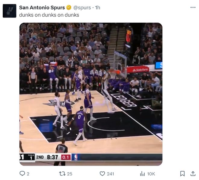 文班亞馬還與哈珀配合出了一個(gè)勢大力沉的空接雙手重扣,這一球讓馬刺主場(chǎng)的球迷們都沸騰了,哈珀這位身高1.96米的高大控衛真的太出彩了。